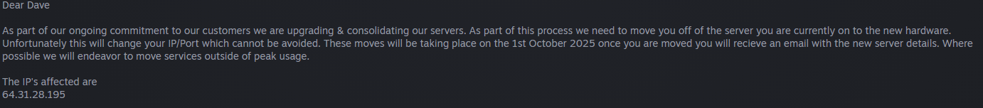 Dear DaveAs part of our ongoing commitment to our customers we are upgrading & consolidating our servers. As part of this process we need to move you off of the server you are currently on to the new hardware. Unfortunately this will change your IP/Port which cannot be avoided. These moves will be taking place on the 3rd of July 2025, once you are moved you will recieve an email with the new server details.The service being moved is23.111.147.110:17501Thank You